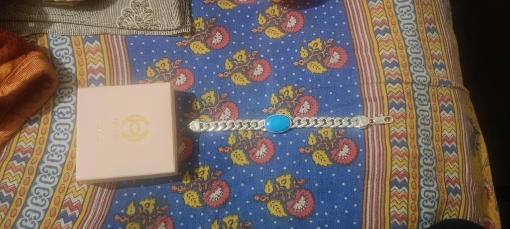 Embrace the signature style of Bollywood icon Salman Khan with this bold, luxurious bracelet. Featuring a vibrant natural Turquoise stone (Firoza) set on a chunky curb chain, this piece makes an unmistakable statement of confidence and power.
